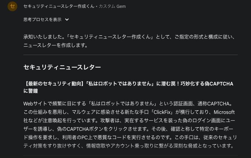 当社ではこの機能を利用し、「セキュリティニュースレターの作成に特化した専用AIアシスタント」を作成しています。これにより、毎回安定した品質のニュースレターを自動で作成できるようになっています。